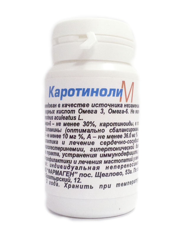 Центром гигиенической сертификации при институте питания РАМН ”Каротиноли-М” рекомендован в качестве источника незаменимых ПНЖК.